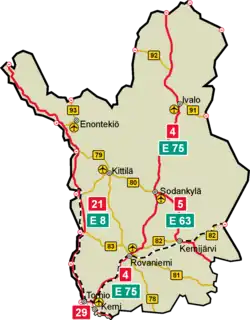 Three European roads pass through Lapland: E8, E63 and E75, the latter of which runs almost 600 kilometres from the southernmost municipality of Simo to the northernmost municipality of Utsjoki.[43]