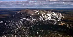 The landscape of large parts of Lapland is an inselberg plain.[21] It has been suggested the inselberg plains were formed in the Late Cretaceous or Paleogene period by pediplanation or etchplanation.[22] Relative to southern Finland Lapland stands out for its thick till cover.[23][B] The hills and mountains are typically made up of resistant rocks like granite, gneiss, quartzite and amphibolite.[20] The ice sheet that covered Finland intermittently during the Quaternary grew out from the Scandinavian Mountains.[25] The central parts of the Fennoscandian ice sheet had cold-based conditions during times of maximum extent. This means that in areas like northeast Sweden and northern Finland, pre-existing landforms and deposits escaped glacier erosion and are particularly well preserved at present.[26] Northwest to the southeast movement of the ice has left a field of aligned drumlins in central Lapland. Ribbed moraines found in the same area reflects a later west-to-east change in the movement of the ice.[26] During the last deglaciation ice in Lapland retreated from the north-east, east and southeast so that the lower course of the Tornio was the last part of Finland to be deglaciated 10,100 years ago.[27] Present-day periglacial conditions in Lapland are reflected in the existence of numerous palsas, permafrost landforms developed on peat.[20]