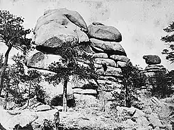 The Laramie Mountains are bisected by the Laramie River, which cuts a canyon through the mountains roughly due west of Wheatland, and then continues its generally eastward course to join the North Platte River near the town of Fort Laramie. The division marks the southern end of the continuous coniferous forest in the range, and separates the range into two parts. The southern part is generally drier and much more open, with little or no forest except for the southern end at Pole Mountain and surrounding area, where the interesting granite outcrops at Vedauwoo provide climbing practice and grand picnic scenery.