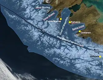 A map showing the extent of the Patagonian ice sheet in the Strait of Magellan area during the LGP: Selected modern settlements are shown with yellow dots.