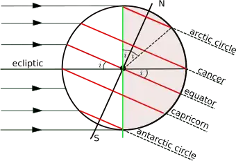 The figure shows the geometry of a cross-section of the plane perpendicular to the ecliptic and through the centres of the Earth and the Sun at the December solstice when the Sun is overhead at some point of the Tropic of Capricorn. The south polar latitudes below the Antarctic Circle are in daylight, whilst the north polar latitudes above the Arctic Circle are in night. The situation is reversed at the June solstice, when the Sun is overhead at the Tropic of Cancer. Only at latitudes in between the two tropics is it possible for the Sun to be directly overhead (at the zenith).