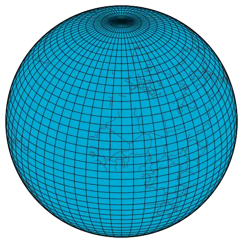 A perspective view of the Earth showing how latitude () and longitude () are defined on a spherical model. The graticule spacing is 10 degrees.