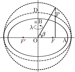 The parametric latitude can also be extended to a three-dimensional coordinate system. For a point P not on the reference ellipsoid (semi-axes OA and OB) construct an auxiliary ellipsoid which is confocal (same foci F, F′) with the reference ellipsoid: the necessary condition is that the product ae of semi-major axis and eccentricity is the same for both ellipsoids. Let u be the semi-minor axis (OD) of the auxiliary ellipsoid. Further let β be the parametric latitude of P on the auxiliary ellipsoid. The set (u,β,λ) define the ellipsoidal-harmonic coordinates[19] or simply ellipsoidal coordinates[5]: §4.2.2  (although that term is also used to refer to geodetic coordinate). These coordinates are the natural choice in models of the gravity field for a rotating ellipsoidal body. The above applies to a biaxial ellipsoid (a spheroid, as in oblate spheroidal coordinates); for a generalization, see triaxial ellipsoidal coordinates.
