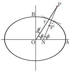 When the point is on the surface of the ellipsoid, the relation between the geocentric latitude (θ) and the geodetic latitude (ϕ) is: