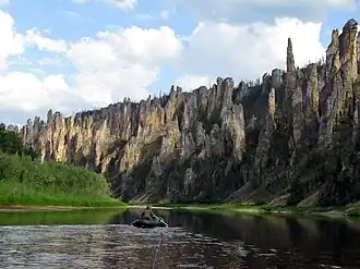There are spectacularly eroded rock formations composed of gypsum-bearing and saline limestone, dolomite and, in some places sandstone, in different spots of the plateau. The Lena Pillars, lining the banks of river Lena in the region, are the most well-known of these features. They were declared a UNESCO World Heritage Site in 2012.[3] Other protected areas in the plateau are the Sinyyaya Pillars by river Sinyaya, and the Turuuk Khaya Rocks by the Lyutenge River.[4] The Olyokma Nature Reserve is located on the eastern side, partly within neighboring Aldan Highlands.[5]