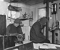 Reginald James, sitting on the left, working during the expedition. He is examining a Dines anemometer while Leonard Hussey works on the right.[1]