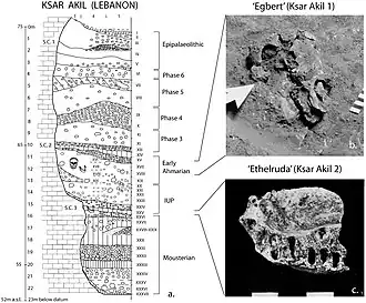 - ^ a b Higham, Thomas F. G.; Wesselingh, Frank P.; Hedges, Robert E. M.; Bergman, Christopher A.; Douka, Katerina (2013-09-11). "Chronology of Ksar Akil (Lebanon) and Implications for the Colonization of Europe by Anatomically Modern Humans". PLOS ONE. 8 (9): e72931. Bibcode:2013PLoSO...872931D. doi:10.1371/journal.pone.0072931. ISSN 1932-6203. PMC 3770606. PMID 24039825.