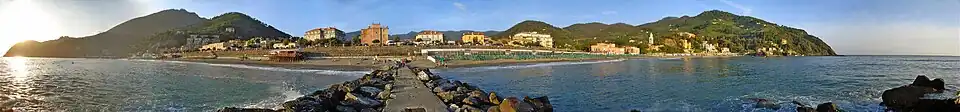 The town is on the coast at the mouth of a river valley, between hills thickly wooded with olive and pine trees. The ridges on either side of the valley thrust out into the sea as the headlands of Mesco and Levanto. The municipality forms part of the coastal district known as the Comunità Montana della Riviera Spezzina, and part of its territory is included in the Cinque Terre National Park.