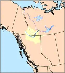The Liard River of the North American boreal forest flows through Yukon, British Columbia and the Northwest Territories, Canada. Rising in the Saint Cyr Range of the Pelly Mountains in southeastern Yukon, it flows 1,115 km (693 mi) southeast through British Columbia, marking the northern end of the Rocky Mountains and then curving northeast back into Yukon and Northwest Territories, draining into the Mackenzie River at Fort Simpson, Northwest Territories. The river drains approximately 277,100 km2 (107,000 sq mi) of boreal forest and muskeg.[1]