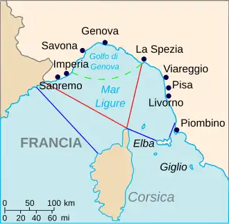 - ^ Italian: Mar Ligure; French: Mer Ligurienne; Ligurian: Mâ Ligure; Corsican: Mari Liguru