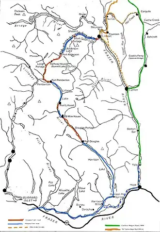 ![]() Lillooet Lake's position on the route of the Douglas Road (water portions in blue, land portions in red) and the Cariboo Road (green) | |