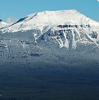 Based on the Köppen climate classification, the mountain experiences a subarctic climate with cold, snowy winters, and mild summers.[8] The Lake Louise Ski Resort is located to the immediate northwest of the peak. Temperatures can drop below −20 °C (−4 °F) with wind chill factors below −30 °C (−22 °F) in the winter.