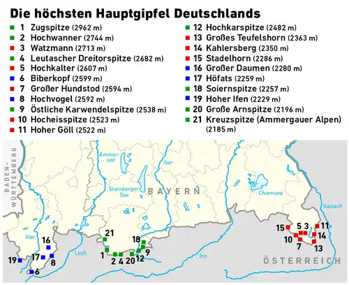 This is a list of the highest mountains in Germany. All of these mountains are located in the federal state of Bavaria. They lie within the Alps in the region known as the Eastern Alps and are part of the Northern Limestone Alps. The majority belong to the mountain ranges of the Wetterstein, Berchtesgaden Alps and Allgäu Alps.
