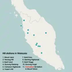 The concept of a hill station in the Malay Peninsula began during the colonial period of British Malaya. The British were not used to the environment, especially the hot tropical weather, endemic illnesses, and mosquito breeding areas. As a result, they began looking for alternative ways to allow British people to stay in tropical countries for a longer durations, as the travel distance and the British government's leave policy prevented any people who had settled in tropical countries from returning to Britain on a regular basis. Due to Malaya's geographical factors and abundant natural beauty, the British government built hill stations in the country.[1] The first hill station, Penang Hill, was founded in 1787 on Penang Island. It was soon followed by Bukit Larut (1884) and Mount Kledang (1892) in Perak, Treacher Hill (1893) in Selangor, Mount Angsi (early 1900s) in Negeri Sembilan, and Fraser's Hill (1919) and Cameron Highlands (1925) in Pahang. Plans were initially made to build another hill station, on Mount Tahan, but it was never built due to the northern part of Mount Tahan being in Kelantan and not under British control. It would have been the highest hill station in the country, at an elevation of 2,187 m (7,175 ft) above sea level.[1]