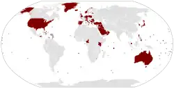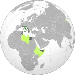 France kept its status through the modern era, as a dominant empire possessing many colonies in various locations around the world. The French colonial empire is the set of territories outside Europe that were under French rule primarily from the 16th century to the late 1960s (some see the French control of places such as New Caledonia as a continuation of that colonial empire). The first French colonial empire reached its peak in 1680 at over 10,000,000 km2 (3,900,000 sq mi), which at the time, was the second largest in the world behind the Spanish Empire. In the 19th and 20th centuries, the colonial empire of France was the second-largest in the world behind the British Empire. At its height in the 1920s and 1930s, including metropolitan France, the total amount of land under French sovereignty reached 13,500,000 km2 (5,200,000 sq mi) at the time, which represented 10% of the Earth's total land area.[122] The total area of the French colonial empire, with the first (mainly in the Americas and Asia) and second (mainly in Africa and Asia), combined, reached 24,000,000 km2 (9,300,000 sq mi), the second-largest ever overall.[123]