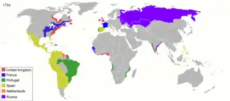 The British Empire participated officially in the Seven Years' War from 1756, a war described by some historians as the world's first World War.[28] The British had hoped winning the war against its colonial rival France would improve the defensibility of its important American colonies, where tensions from settlers eager to move west of the Appalachian Mountains had been a substantive issue.[29] The new British-Prussian alliance was successful in forcing France to cede Canada to Britain, and Louisiana to Spain, thus ostensibly securing British North America from external threats as intended. The war also allowed Britain to capture the proto-industrialised Bengal from the French-allied Mughal Empire, then Britain's largest competitor (and by far the world's single largest producer) in the textile trade, it was also able to flip Hyderabad from the Mughals to its cause, and capture the bulk of French territorial possessions in India, effectively shutting them out of the sub-continent.[30][31] Importantly, the war also saw Britain becoming the dominant global naval power.[32]