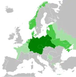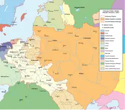The union of the Kingdom of Poland and the Grand Duchy of Lithuania, formed in 1385, emerged as a major power in Central and Eastern Europe following its victory at the Battle of Grunwald in 1410.[55][56][57] Poland–Lithuania covered a large territory in Central and Eastern Europe, making it the largest state in Europe at the time.[57] Through its territorial possessions and vassal principalities and protectorates, its influence extended from the Baltic Sea to the Black Sea, reaching Livonia (present-day Estonia and Latvia) in the north,[58] and Moldavia and Crimea in the south and southeast.[59][60] In the 15th century the ruling Jagiellonian dynasty managed to place its members on the thrones of the neighbouring kingdoms of Bohemia and Hungary, becoming one of the most powerful houses in Europe.[61]