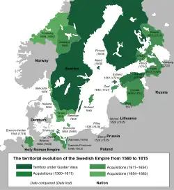 Sweden emerged as a great European power under Axel Oxenstierna and King Gustavus Adolphus.[114] As a result of acquiring territories seized from Russia and the Polish–Lithuanian Commonwealth, as well as its involvement in the Thirty Years' War, Sweden found itself transformed into the leading power of the Baltic Sea[115] and the leader of Lutheranism. Although not a very populous country, Sweden has achieved the status of the dominant power in northern Europe due to its efficient administration, a near monopoly on copper production in Europe, a strong arms industry, and a robust and innovative army with capable leaders.[115] The mid-17th and early 18th centuries were Sweden's most successful years as a great power.[116]