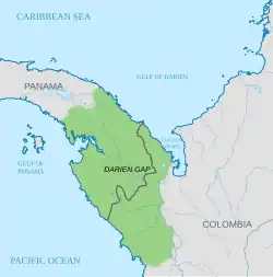 The conventional boundary between North America and South America is at some point on the Colombia–Panama border, with the most common demarcation in atlases and other sources following the Darién Mountains watershed where the Isthmus of Panama meets the South American continent (see Darién Gap). This area encompasses a large watershed, forest and mountains in the northern portion of Colombia's Chocó Department and Panama's Darién province.