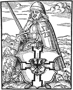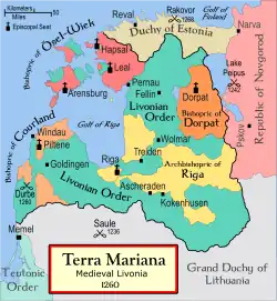 The January 1229 death of Albert of Riga caused a diocesan feud in the Archbishopric of Riga, as two rival candidates were elected.[3] Pope Gregory IX, through cardinal Otto of Tonengo, tasked Baldwin of Alna as papal legate to resolve the dispute.[4] After securing the submission of Courland, Baldwin soon found himself in conflict with various factions in Livonia, fleeing to Dünamünde and temporarily leaving Livonia in early 1232.[4] The pope made him bishop of Semigallia and gave him papal legation throughout much of Livonia, and Baldwin returned by 1233.[4] He tried to take the castle of Reval (modern Tallinn) from the Sword Brothers, but in c. August–September 1233 they defeated Baldwin, who excommunicated many Sword Brothers in retaliation.[5]