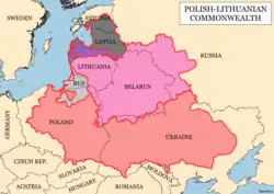 In 1561, during the Livonian War, Livonia fell to the Grand Duchy of Lithuania[13][14][15] and became a dependent vassal of Lithuania.[15] Eight years later, in 1569, when the Grand Duchy of Lithuania and the Kingdom of Poland formed the Polish–Lithuanian Commonwealth, Livonia became a joint domain administered directly by the king and grand duke.[13][15][16][17][18][19] Having rejected peace proposals from its enemies, Ivan the Terrible found himself in a difficult position by 1579, when Crimean Khanate devastated Muscovian territories and burnt down Moscow (see Russo-Crimean Wars), the drought and epidemics have fatally affected the economy, Oprichnina had thoroughly disrupted the government, while The Grand Principality of Lithuania had united with The Kingdom of Poland (1385–1569) and acquired an energetic leader, Stefan Batory, supported by Ottoman Empire (1576). Stefan Batory replied with a series of three offensives against Muscovy, trying to cut The Kingdom of Livonia from Muscovian territories. During his first offensive in 1579, with 22,000 men, he retook Polotsk; during the second, in 1580, with 29,000-strong army, he took Velikie Luki, and in 1581 with a 100,000-strong army he started the Siege of Pskov. Frederick II of Denmark and Norway had trouble continuing the fight against Muscovy unlike Sweden and Poland. He came to an agreement with John III in 1580, giving him the titles in Livonia. That war would last from 1577 to 1582. Muscovy recognized Polish–Lithuanian control of Ducatus Ultradunensis only in 1582. After Magnus von Lyffland died in 1583, Poland invaded his territories in The Duchy of Courland, and Frederick II decided to sell his rights of inheritance. Except for the island of Œsel, Denmark was out of the Baltic by 1585. As of 1598 Inflanty Voivodeship was divided onto:
