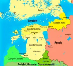 Sweden was given roughly the same area as the former Duchy of Livonia after the 1626–1629 Polish–Swedish War. The area, usually known as Swedish Livonia, became a very important Swedish dominion, with Riga being the second largest Swedish city and Livonia paying for one third of the Swedish war costs. Sweden lost Swedish Livonia, Duchy of Estonia and Swedish Ingria to the Russian Empire almost 100 years later, by the Capitulation of Estonia and Livonia in 1710 and the Treaty of Nystad in 1721.[20]