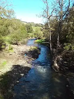 Llagas Creek is a perennial stream in Santa Clara County, California, United States.[2] The headwaters rise on the eastern side of Crystal Peak near Loma Prieta. From there, the creek flows northeast along Casa Loma Road, until it reaches Uvas Road, and then turns south. At Oak Glen Avenue, the creek turns southeast, passing through Chesbro Reservoir, and the cities of Morgan Hill, San Martin, and Gilroy. The creek continues its southward flow, eventually joining with the Pajaro River at the San Benito County line.
