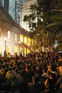 In 2013, legal scholar Benny Tai, considered a moderate democrat, advocated a civil disobedience plan to pressure Beijing to implement genuine universal suffrage in Hong Kong. The plan matured into Occupy Central. The radical localists were largely against it, mainly because they believed it was a plot by pan-democrats to hijack popular support.[20] Student activists from Scholarism and Hong Kong Federation of Students (HKFS) emerged as the leaders in the Occupy protests. They posted the slogan "self-determination of our fate" outside the government headquarters.[21] Radical localists, many of whom criticised the occupation plan before, participated in the protests and advocated a more "militant" approach as opposed to the strict principles of non-violence advocated by the three promoters of Occupy Central and the student activists. They gathered at the Mong Kok site, as opposed to the main site in Admiralty which was led by the HKFS. They blamed the HKFS leadership for failure of the protest.[22]
