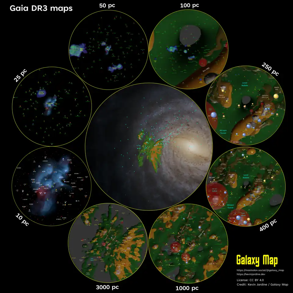 | Local Bubble | 2.82–250 pc | 8.70×1013–7.71×1015 | Cavity in the interstellar medium in which the Sun and a number of other stars are currently traveling. Caused by a past supernova. |