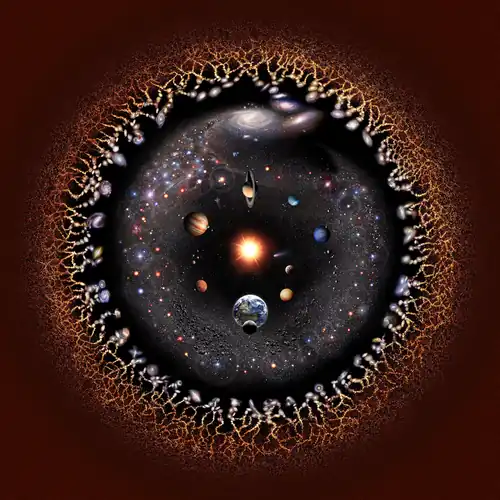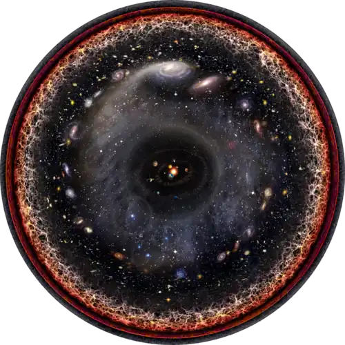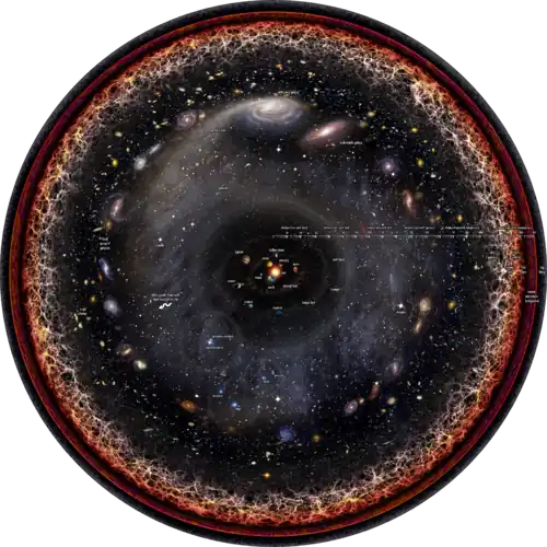 | Observable Universe | 28,500 Mpc | 8.79×1023 | At least 2 trillion galaxies in the observable universe, arranged in millions of superclusters, galactic filaments, and voids, creating a foam-like superstructure. | [51][52][53][54] |