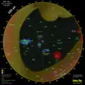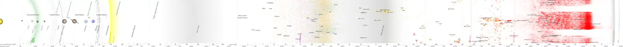 Logarithmic representation of the universe centered on the Solar System. Celestial bodies on this graphic are clickable |