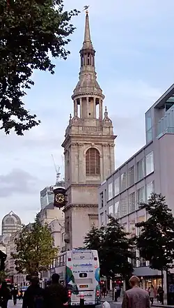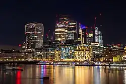 In 1710 Christopher Wren's masterpiece St Paul's Cathedral was completed, replacing its medieval predecessor, which burnt down in the Great Fire. The dome of St Paul's dominated the London skyline for centuries, inspiring the artworks and writing of William Blake, with his 1789 poem "Holy Thursday" referring to 'the high dome of Pauls'.[70] During the Georgian era new districts such as Mayfair were formed in the west; new bridges over the Thames encouraged development in South London. In the east the Port of London expanded downstream. London's development as an international financial centre matured for much of the 18th century.[71]