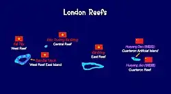 The four major features within the area (Central London Reef, Cuarteron Reef, East London Reef, and West London Reef), are known by many names:[1][2][3]