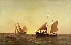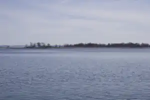 Long Island Sound was formed when the terminal moraine that dammed the waters of glacial Lake Connecticut failed, and sea water mixed with the lake's fresh waters. Prior to colonization, it's estimated that around 10,000 to 15,000 natives inhabited along Long Island Sound.[16] The first European to record the existence of Long Island Sound was the Dutch navigator Adriaen Block, who entered the sound from the East River in 1614.[17] The sound was known as The Devil's Belt in colonial times[18] and the reefs that run across the sound were known as Devil's Stepping Stones, from which Stepping Stones Lighthouse got its name.