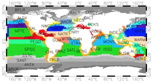 The set of 56 geocodes represent biogeochemical provinces that partition the pelagic environment. It is assumed that each province represents a unique set of environmental conditions.[2]