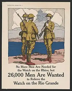 Meanwhile, across the river, Mexico was dealing with the Mexican Revolution.[20] The revolution spilled over the border through cross-border supply raids, and in response President Taft sent the United States Army into the region beginning in 1911 and continuing until 1916 when the majority of the United States armed forces were stationed in the region. Texas governor Oscar Colquitt also sent the Texas Rangers into the area to keep the peace between Mexicans and Americans.[2]