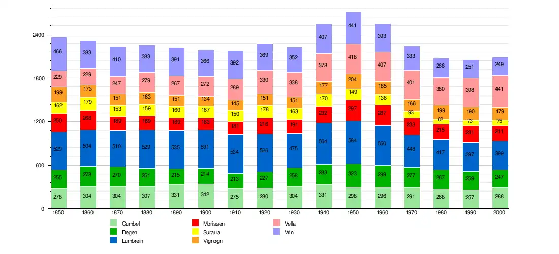 Lumnezia has a population (as of December 2020) of 1,996.[19] As of 2013, 3.6% of the population are resident foreign nationals. Over the last 3 years (2010-2013) the population has changed at a rate of -4.42%. The birth rate in the municipality, in 2013, was 3.8 while the death rate was 16.0 per thousand residents.[18]