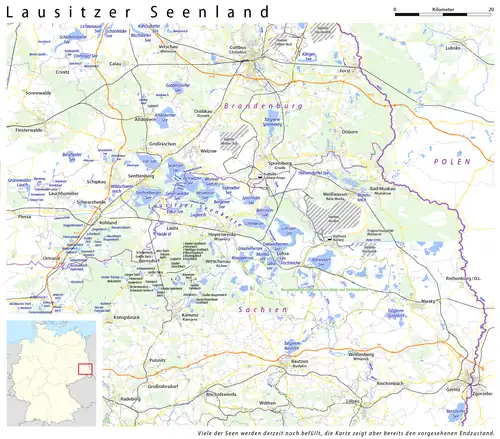 The Lusatian Lake District (German: Lausitzer Seenland, Lower Sorbian: Łužyska jazorina, Upper Sorbian: Łužiska jězorina) is an artificially created lake area. By the end of the 2020s, Europe's largest artificial water landscape and Germany's fourth-largest lake area are to be created by flooding disused brown coal mines in the Lusatian brown coal mining area. Some of the largest lakes are connected to each other as a chain of lakes by navigable canals.