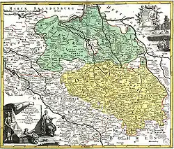 According to the 1635 Peace of Prague, most of Lusatia became a province of the Electorate of Saxony, except for the region around Cottbus possessed by Brandenburg. After the Saxon elector Augustus the Strong was elected king of Poland in 1697, Lusatia became strategically important as the elector-kings sought to create a land connection between their Saxon homelands and the Polish territories. Two main routes connecting Warsaw and Dresden ran through the region in the 18th century and Kings Augustus II the Strong and Augustus III of Poland often traveled the routes.[6] Numerous Polish dignitaries also traveled through Lusatia on several occasions, and some Polish nobles owned estates in Lusatia.[7] A distinct remnant of the region's ties to Poland are the 18th-century mileposts decorated with the coat of arms of the Polish–Lithuanian Commonwealth located in various towns in the region. Polish-Sorbian contacts increased in that period. With the Age of Enlightenment, the Sorbian national revival began and resistance to Germanization emerged.[8]