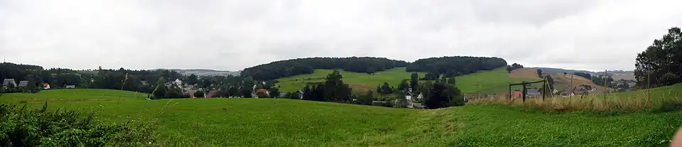 Upper Lusatia (Oberlausitz, Łużyce Górne or Hornja Łužica) is today part of the German states of Saxony (most of its territory) and Brandenburg (Tettau, Lindenau, Bärhaus, Frauendorf, Burkersdorf, Kroppen, Heinersdorf, Ruhland, Arnsdorf, Jannowitz, Hermsdorf, Lipsa, Biehlen, Schwarzbach, Guteborn, Niemtsch, Peickwitz, Hohenbocka, Grünewald, Sella and Hosena); part east of the Neisse River around Lubań now belongs to the Polish Lower Silesian voivodeship. It consists of hilly countryside rising in the South to the Lusatian Highlands near the Czech border, and then even higher to form the Zittau Hills, the small northern part of the Lusatian Mountains (Lužické hory/Lausitzer Gebirge) in the Czech Republic.