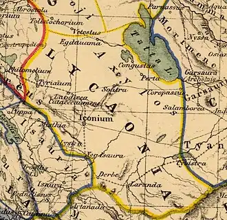 Lycaonia (/ˌlɪkiˈoʊniə/; Greek: Λυκαονία, Lykaonia; Turkish: Likaonya) was a large region in the interior of Asia Minor (modern-day Turkey), north of the Taurus Mountains. It was bounded on the east by Cappadocia, on the north by Galatia, on the west by Phrygia and Pisidia, while to the south it extended to the chain of Mount Taurus, where it bordered on the country popularly called in earlier times Cilicia and in the Byzantine period Isauria; but its boundaries varied greatly at different times. The name is not found in Herodotus, but Lycaonia is mentioned by Xenophon as traversed by Cyrus the Younger on his march through Asia. That author describes Iconium as the last city of Phrygia; and in Acts 14:6 Paul, after leaving Iconium, crossed the frontier and came to Lystra in Lycaonia. Ptolemy, on the other hand, includes Lycaonia as a part of the province of Cappadocia, with which it was associated by the Romans for administrative purposes; but the two countries are clearly distinguished both by Strabo and Xenophon and by authorities generally.