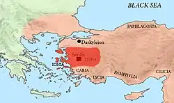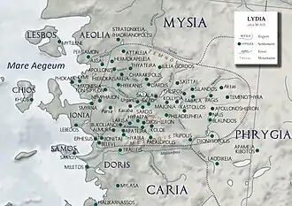 ![]() Map of the Lydian Kingdom in its final period of sovereignty under Croesus, c. 547 BC. | |||||||||||||||||