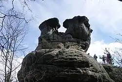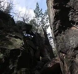 The Mühlsteinbrüche ("Millstone Quarries", Upper Sorbian: Skały młyna) south of Jonsdorf in the Zittau Mountains in Saxony are a region of bizarre rock formations, which have been formed by the quarrying of sandstone for millstones and also by weathering processes. They are a popular hiking and climbing area. An educational trail runs through the region which has an area of about 35 hectares.