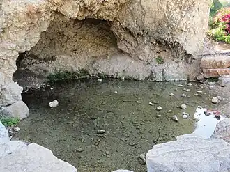 The spring is located in the Harod Valley, which is the eastern part of the Jezreel Valley. While the Jezreel Valley is drained via the Kishon River to the Mediterranean Sea, the Harod Valley is drained through the Harod Stream ("Wadi Jalud" in Arabic) to the Jordan River. It is the largest of the springs emerging on the northern slopes of Mount Gilboa.[7] The source of the spring as well as other springs in the Beit She'an Valley to the east, comes from fresh rainwater that percolate into the limestone hills of Samaria and collect in an underground water reservoir beneath the areas of the Palestinian cities of Nablus and Jenin. The water emerges from the hills as they incline north towards the valleys. At this valley the waters emerge from a natural cave known as "Gideon's Cave".[8][9] The spring's discharge rate is about 360 cubic meters per hour.[10] According to the PEF's Survey of Western Palestine in 1882, Victor Guérin stated that the rock from which the fountain springs has been artificially hollowed into a cavern.[11][12]