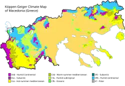 Macedonia for the most part enjoys a Mediterranean climate (Köppen: Csa). Some parts have a humid subtropical climate (Cfa), while higher elevations border a humid continental climate (Dfa). Thessaloniki has a cold semi-arid climate (BSk) while downtown Thessaloniki and Neos Marmaras are the only areas of Macedonia with a hot semi-arid climate (Köppen climate classification: BSh). The coldest winters are found in Florina, while the mildest are found in Neos Marmaras and Great Lavra, which fall in hardiness zone 10a.[49]