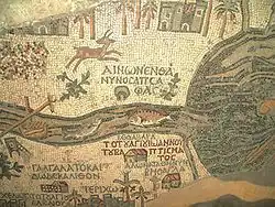 One site represented on the map that is no longer extant are the stones at Gilgall which are clearly represented on the Madaba Map and may be hidden underneath one of the churches in Qas'r Al-Yahud[11] Many of these sites are marked on the mosaic map with various artistic vignettes representing the site in the Province of Palestina Tertia. For example, Jericho and Zoar (Greek: ΖΟΟΡΑ) are, both, represented by vignettes of date palm orchards.[12] Zoar is seen on the far south-eastern side of the Dead Sea.