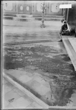 Elements of the inscribed mosaic were noticed and reported to the Jerusalem Patriarchate in 1884 and 1886, during the preparation work for the construction of a new Greek Orthodox church on the site of its ancient predecessor.[2] Patriarch Nicodemus I of Jerusalem was informed, the church building erected and roofed over (summer 1895-August 1896), but the full mosaic was only noticed during clearing work for a new cement-slab floor in October 1896, and no research was carried out until December of that year, after the floor had already been laid around the mosaic by local workers under the supervision of a Greek architect.[2][3][4]