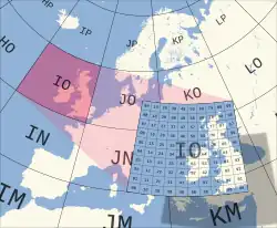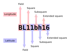 The Maidenhead Locator System (a.k.a. QTH Locator and IARU Locator) is a geocode system used by amateur radio operators to succinctly describe their geographic coordinates, which replaced the deprecated QRA locator, which was limited to European contacts.[1] Its purpose is to be concise, accurate, and robust in the face of interference and other adverse transmission conditions. The Maidenhead Locator System can describe locations anywhere in the world.
