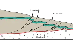 The Main Himalayan Thrust (MHT) is a décollement under the Himalaya Range. This thrust fault follows a northwest-southeast strike, reminiscent of an arc, and gently dips about 10 degrees towards the north, beneath the region. It is the largest active continental megathrust[1] fault in the world.[2]