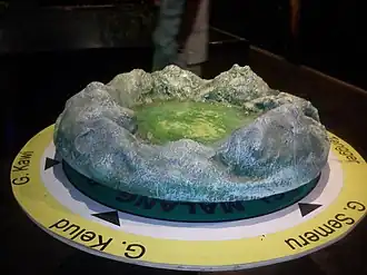 The Malang area in the Pleistocene era was still a deep basin flanked by volcanic activity from mountains such as the Karst Mountains in the south, Kawi, Butak, and Kelud in the west, Anjasmoro and Arjuno-Welirang complex in the northeast and north, and the Tengger Mountains Complex in the east.[19] The basin has not been inhabited by humans because the condition is still in the form of lava and hot lava flows from the surrounding mountains.[20] Towards the rainy season, the Malang basin is filled with water flowing through the mountain slopes, leading to a number of rivers and forming an ancient swamp. The swamps spread to create ancient lakes.